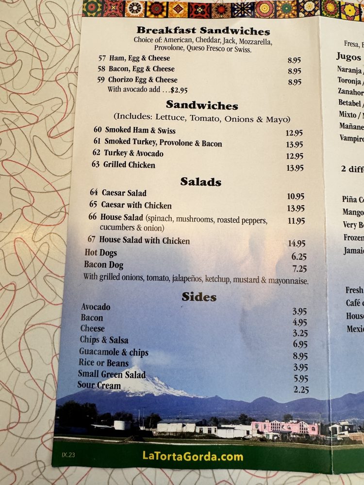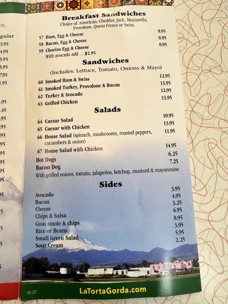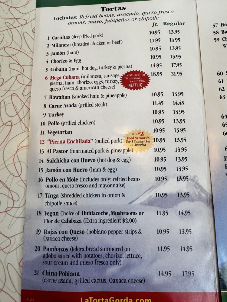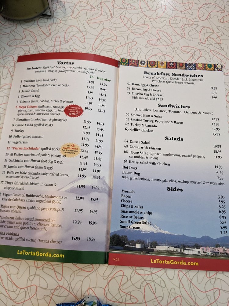Milanesa, sausage, pierna, ham, chorizo, eggs, turkey, queso fresco, and American cheese.